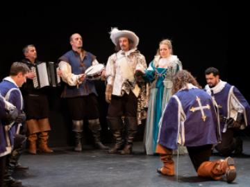 Le cliquetis de mousquets, le jeu des amples capes rouges et noires et les cavalcades effrénées... accompagnés par des musiciens sur scène !